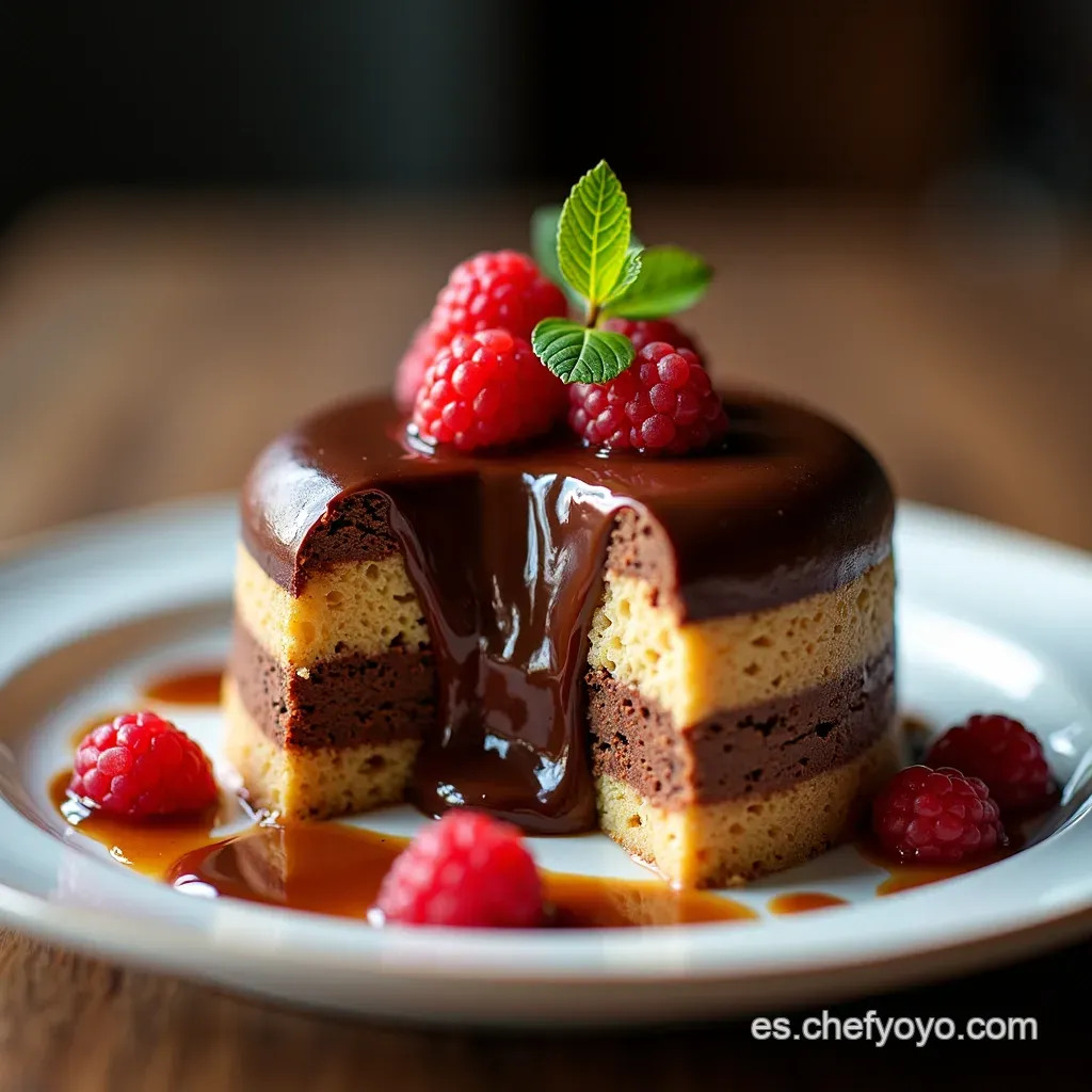 Para elevar la presentación del Chocoflan o Pastel Imposible , consideren servirlo con una guarnición fresca. Unas pocas frambuesas o fresas laminadas aportan una acidez necesaria para equilibrar la dulzura.