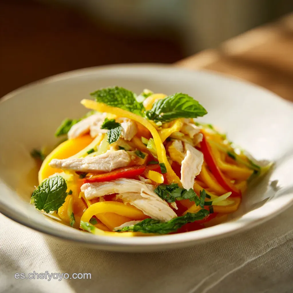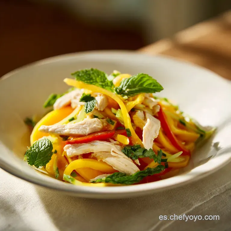 La idea es que cada tenedorada sea una mezcla de hilos de pollo, tiras de mango y filamentos de vegetales. Esta armonía es lo que define a una ensalada internacional muy refrescante de calidad profesional.